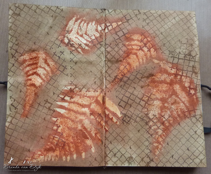 | Als eerste heb ik met behulp van een steen/muur sjabloon de kleuren E13 en E15 op de achtergrond gespoten. |